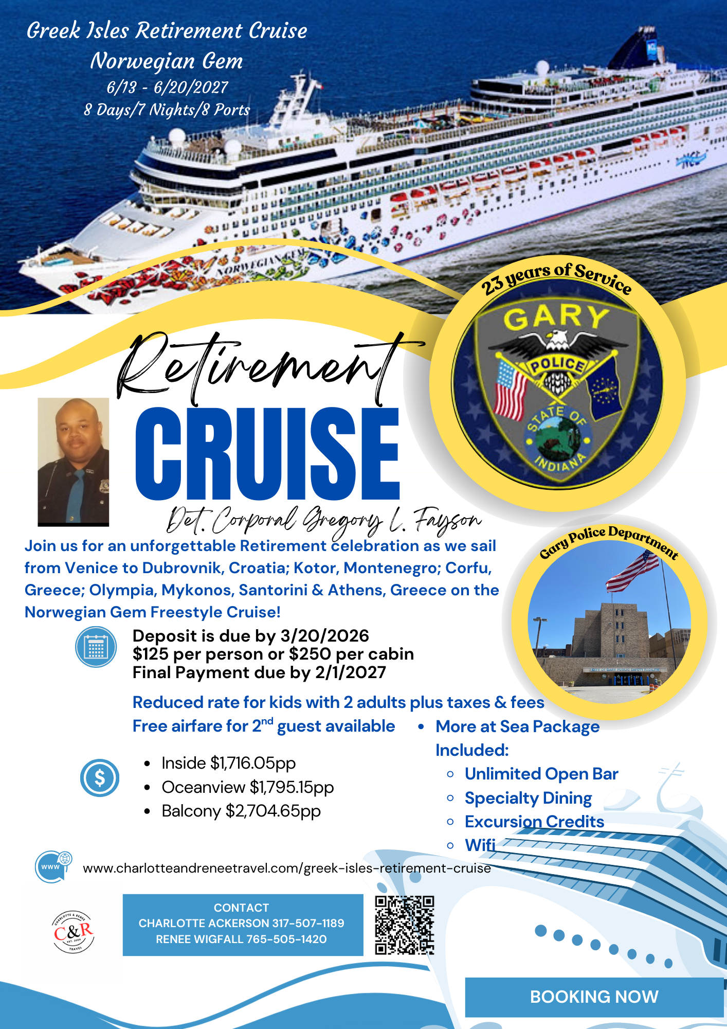 You’re invited to join us as we celebrate Det. Corporal Gregory L. Fayson’s Retirement after 23 years of service with the Gary Police Department. The 8 beautiful ports below are awaiting your arrival. You don’t want to miss this exciting Retirement Cruise. When we sell out, we will start a waitlist. Don’t wait, book your cabin today and enjoy the gift of fun, fellowship, great food and lots to see & do! Please scroll to the bottom to complete the Guest Reservation Request Form. Charlotte or Renee will contact you to complete the booking process.