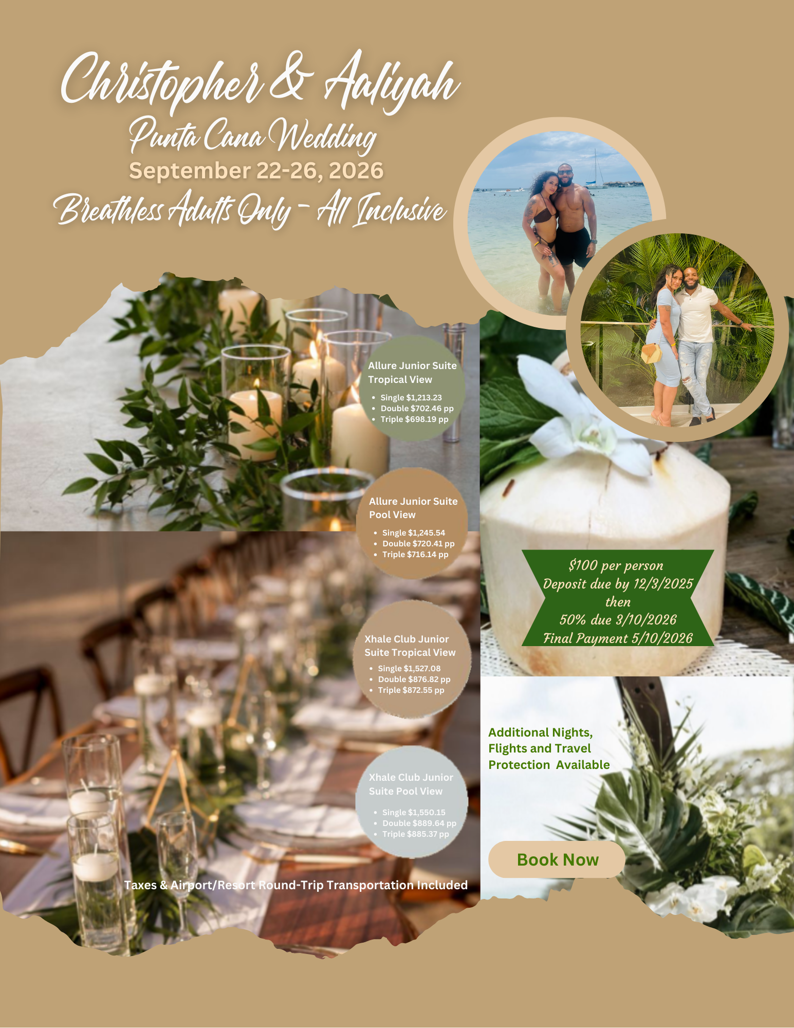 You’re invited to join Chris and Aaliyah in Punta Cana for their destination wedding at the Beautiful Breathless Adult Only - All Inclusive Resort & Spa on September 24, 2026. Please complete the Guest Reservation Request Form to book your room.